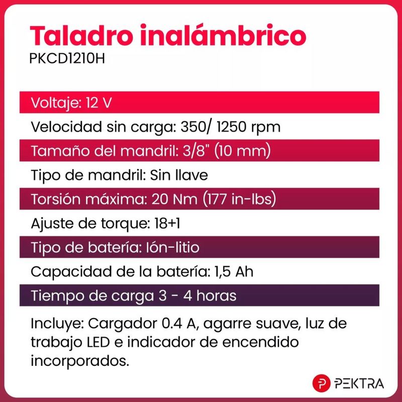 TALADRO INALAMBRICO 12V PEKTRA PKCD1210H