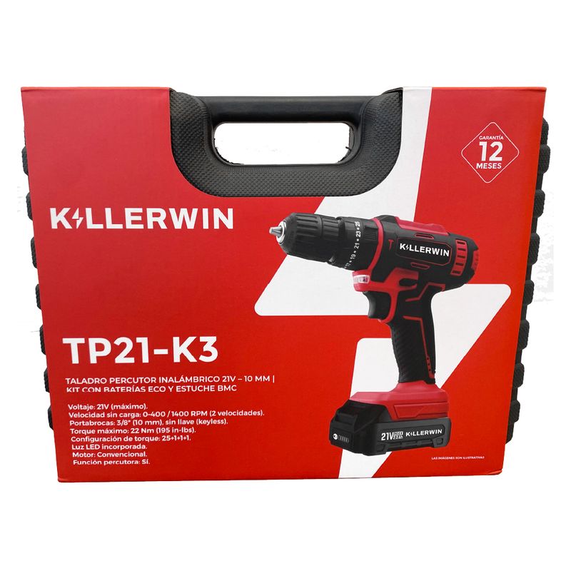 El Taladro Percutor Inalámbrico Killerwin TP21-K3 está diseñado para ofrecer un equilibrio ideal entre potencia, control y versatilidad. Su formato compacto y su plataforma 21V Máx lo convierten en una herramienta confiable tanto para trabajos de atornillado precisos como para perforaciones exigentes. Gracias a sus 25 ajustes de torque, permite trabajar con mayor control, evitando dañar tornillos o superficies y logrando terminaciones prolijas.