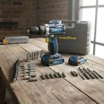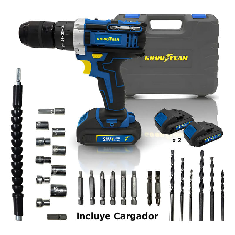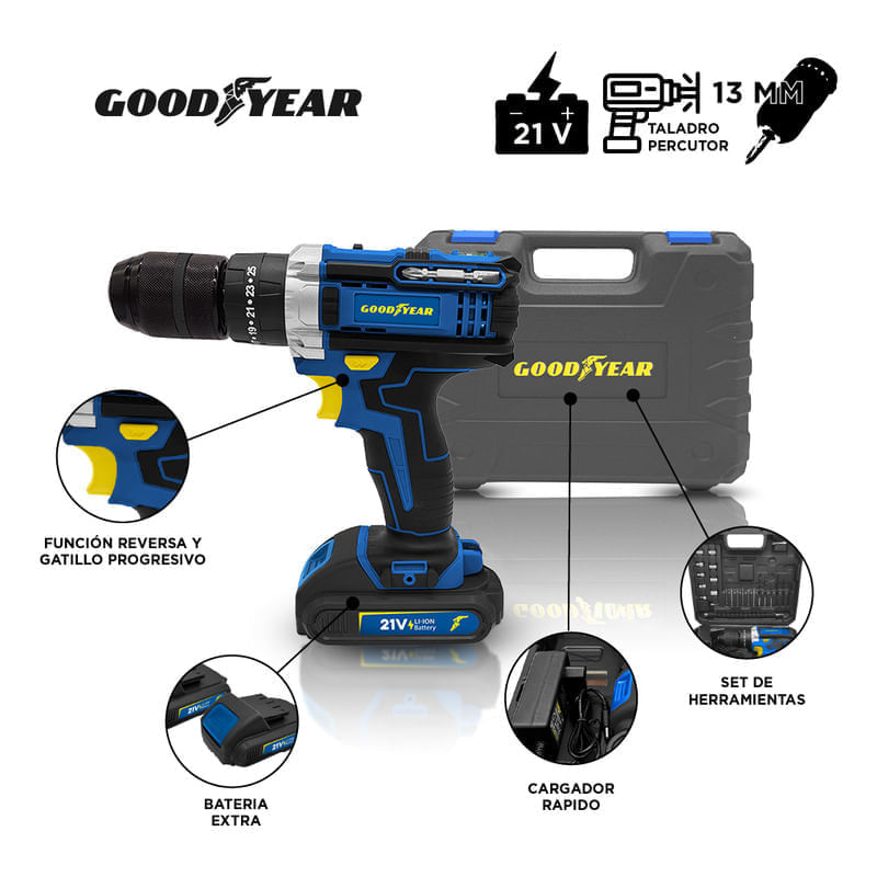 Taladro percutor Goodyear GY30211ID 21V con batería de litio doble, portabrocas de 13 mm y torque regulable. Diseñado para brindar potencia, control y comodidad en tareas exigentes.