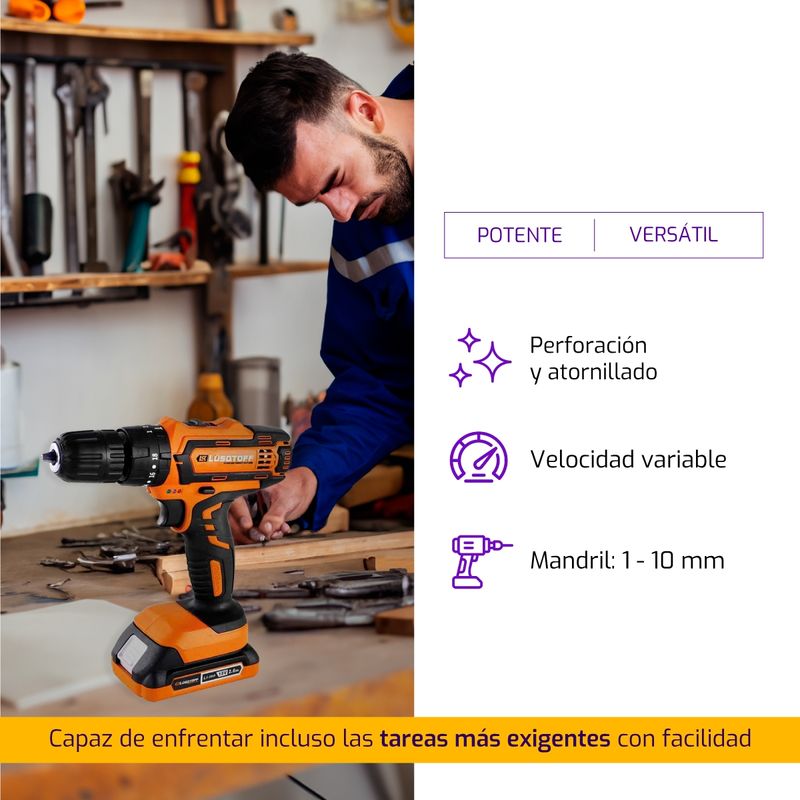 El Taladro Percutor Inalámbrico Lusqtoff ATL18-8B 18v es una herramienta potente y versátil diseñada para abordar una amplia gama de tareas de perforación y atornillado con facilidad y eficiencia. Equipado con una batería de iones de litio de 18V y 2.0 Ah, este taladro ofrece la libertad de movimiento sin comprometer la potencia.