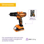 Con un torque de 25 Nm, este taladro es capaz de enfrentar incluso las tareas más exigentes con facilidad. A pesar de su potencia, es sorprendentemente ligero, con solo 3,20 kg, lo que lo hace fácil de manejar y transportar.
