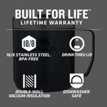 • La tapa Tritan segura de ajuste a presión también evita las salpicaduras para que pueda tomar sorbos fácilmente en la cocina, en el trabajo o alrededor de la fogata.