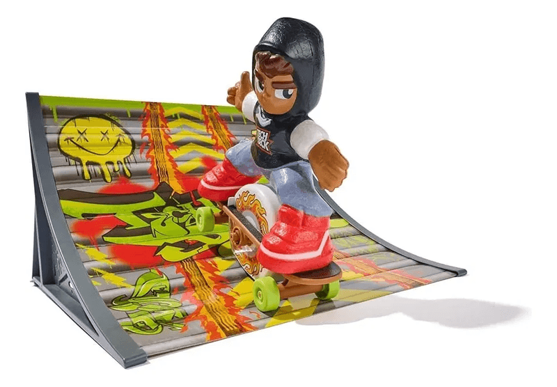 Armá la rampa y colocá la patineta en el lanzador. Presioná el mecanismo para impulsar la patineta y realizá saltos y trucos sobre la rampa. Ideal para jugar solo o en grupo.