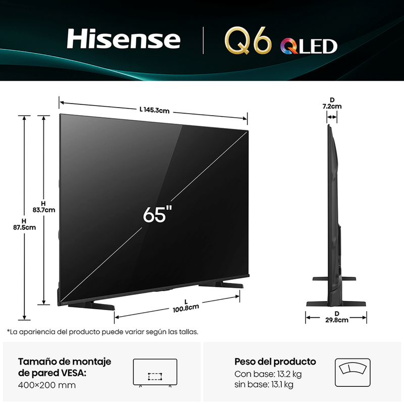 Smart TV Hisense QLED 65Q6QV 65" 4K con VIDAA: Colores Vibrantes, Movimiento Fluidos y Experiencia Cinematográfica