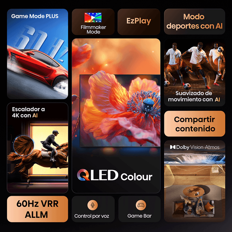 Tecnologías de imagen: QLED Color, AI 4K Upscaler, AI Smooth Motion, Dolby Vision, Filmmaker Mode