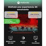 El televisor Motorola MT5510 cuenta con una pantalla de 55 pulgadas y resolucion 4K UHD que brinda una experiencia visual envolvente. Su sistema Android Tv permite acceder a plataformas de streaming aplicaciones y juegos desde un solo lugar. Ofrece navegacion fluida y facil acceso al contenido. Es ideal para disfrutar series peliculas y videos en alta definicion.