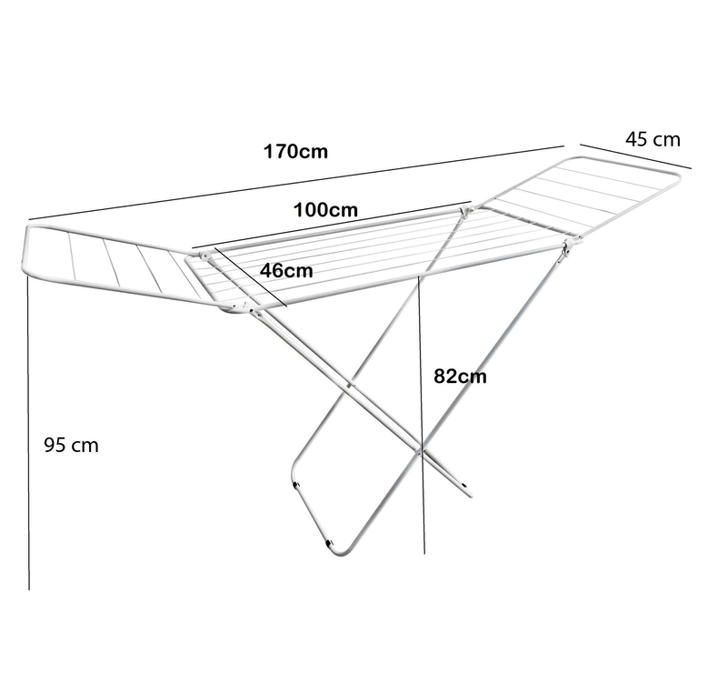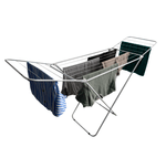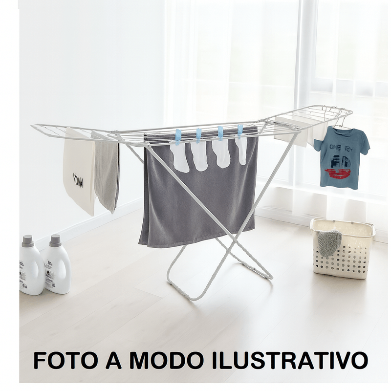 Elegante y practico Tender plegable de Pie con alas , fabricado en acero cubierto con pintura epoxi resistente a la humedad .