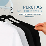 El acabado de terciopelo añade un toque elegante a tu closet. Es importante descolgar las prendas de manera delicada.