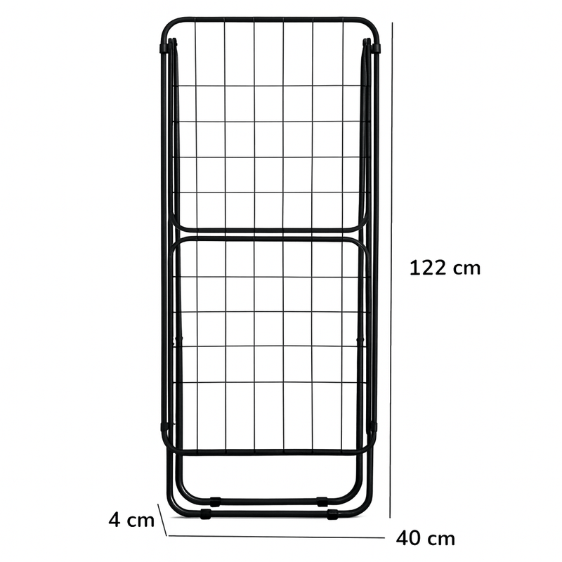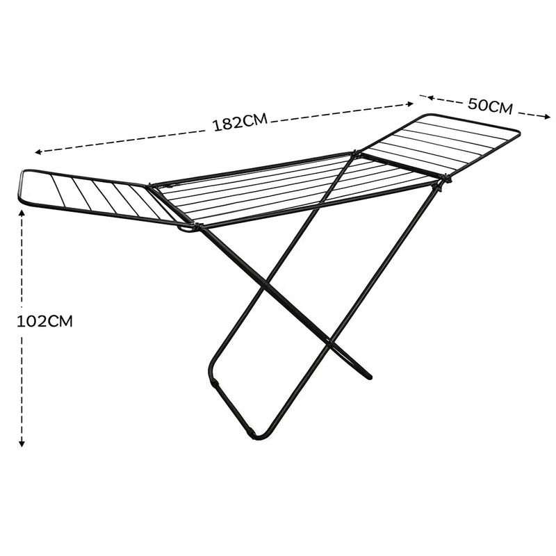 Tender plegable de pie con alas, fabricado en acero cubierto con pintura epoxi resistente a la humedad. Posee tacos plásticos en la base para evitar que se oxide y que raye el piso.