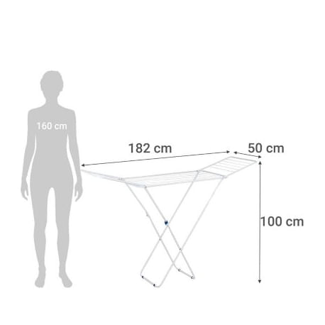Este tendedero, fabricado en metal resistente, ofrece una amplia superficie de secado con sus 182 cm de largo y 50 cm de ancho. Su diseño con alas te permite colgar más prendas, maximizando el espacio disponible. Además, es plegable, lo que facilita su almacenamiento cuando no está en uso. Con un peso de solo 2 kg, es fácil de mover y colocar donde lo necesites