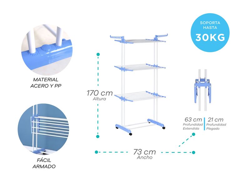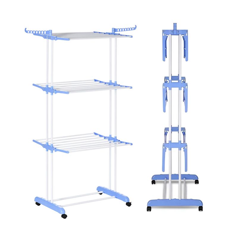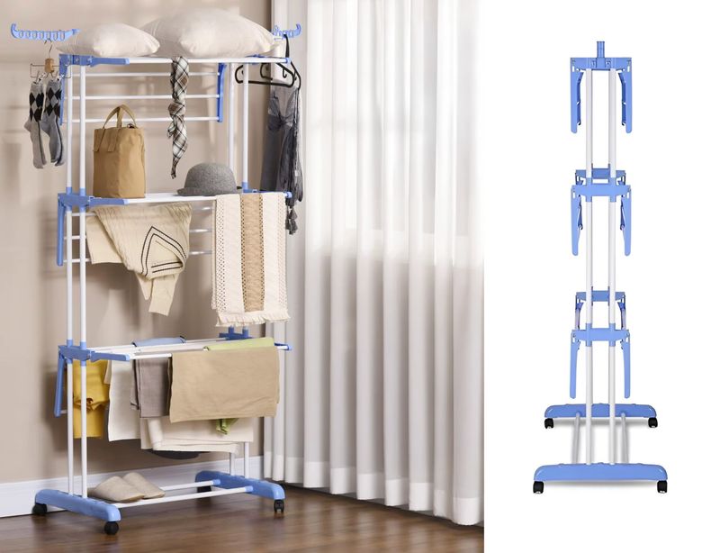 Tender plegable de 3 niveles con alas plegables, base para calzados y soporte para perchas extras.