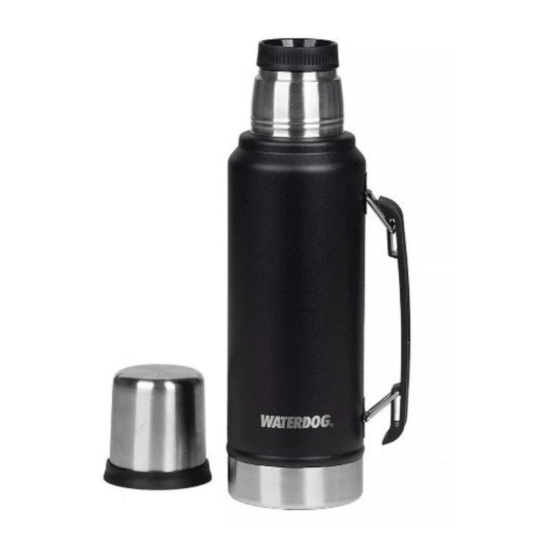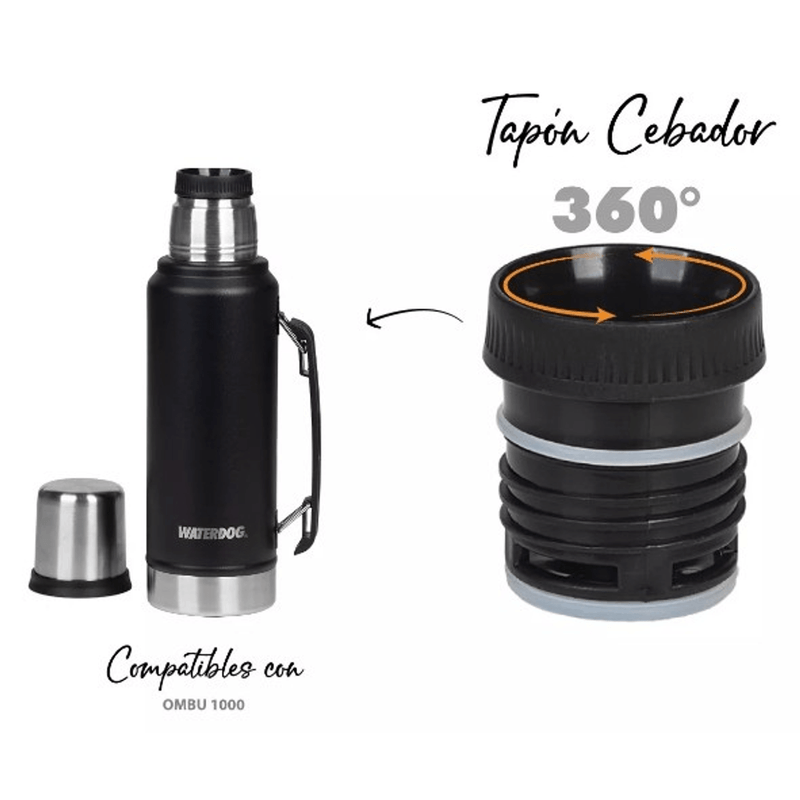 Termo de acero inoxidable de Acero AISI 304 Capacidad: 1000 cc. Con manija de agarre y trasnporte Doble pared aislante Recubrimiento powder Coated. Tapón cebador 360° interior de PP.