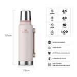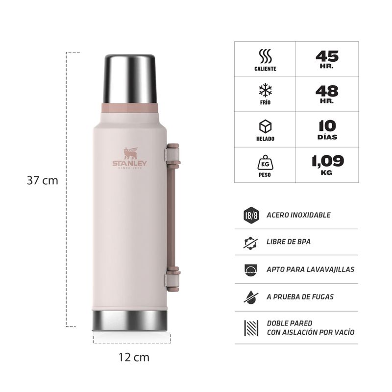 La palabra que viene a la mente es "icónico": diseño elegante, construcción robusta y una actitud indescriptible. Totalmente a prueba de fugas y capaz de mantener las bebidas calientes durante 40 horas, frías durante 45 horas o con hielo durante 6 días. Con el termo Stanley nunca tendrás que preocuparte de que el agua se enfríe o que tu bebida se caliente. Gracias a su pared externa de acero grueso obtendrás un rendimiento térmico que te durará a través de los años.