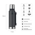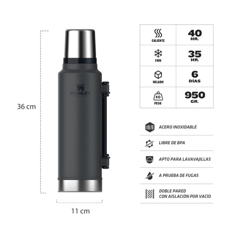 La palabra que viene a la mente es "icónico": diseño elegante, construcción robusta y una actitud indescriptible. Totalmente a prueba de fugas y capaz de mantener las bebidas calientes durante 40 horas, frías durante 45 horas o con hielo durante 6 días. Con el termo Stanley nunca tendrás que preocuparte de que el agua se enfríe o que tu bebida se caliente. Gracias a su pared externa de acero grueso obtendrás un rendimiento térmico que te durará a través de los años.