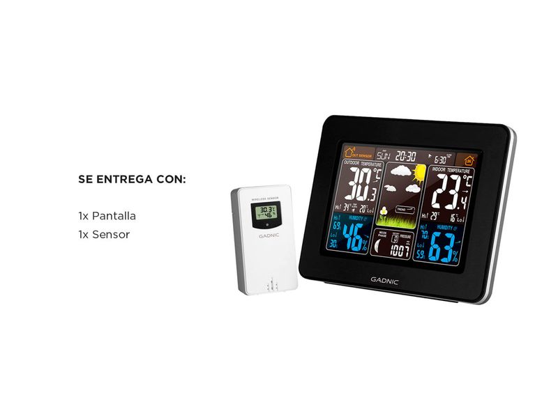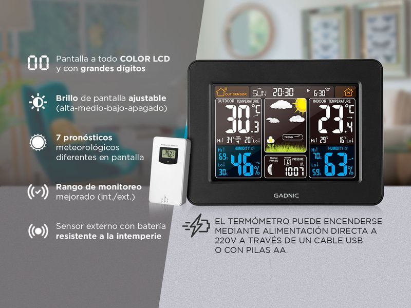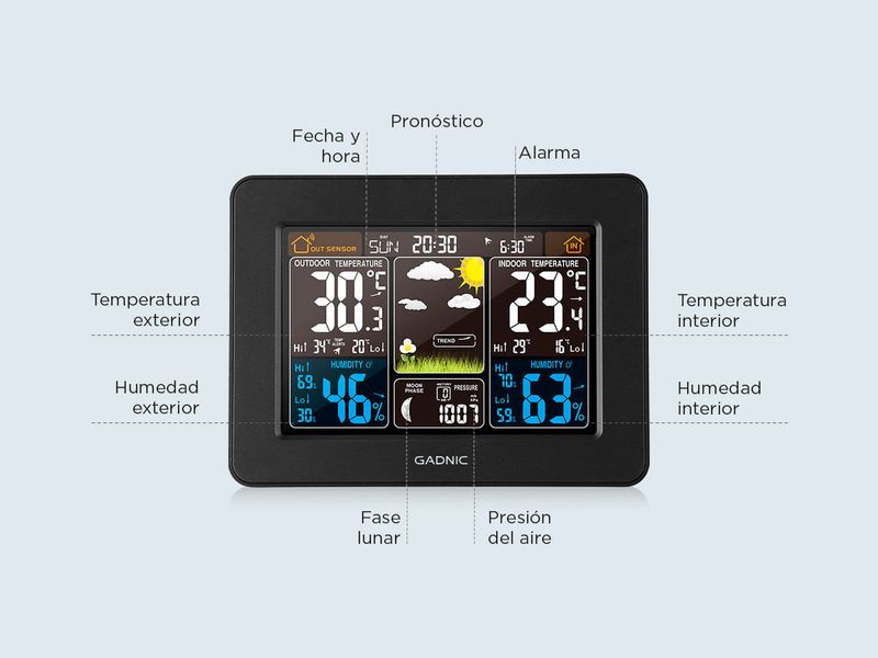 Obtenga los cambios de temperatura y humedad en una sola mano: - Visualización de tendencia de cambio de temperatura, interior (32 °F ~ 122 °F), exterior: (-4 °F ~ 140 °F) Visualización de tendencia de cambio de humedad: interior/exterior: 20 % de HR ~ 95 % HR, pantalla de presión barométrica (detección en las últimas 12 horas): 600 hPa/mb ~ 1100 hPa/mb.
