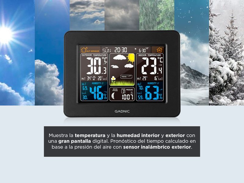 Una pantalla para capturar la dinámica climática deseada: 7 pronósticos meteorológicos (soleado, nublado, nublado, lluvia ligera, lluvia intensa, nieve ligera, nieve intensa) y pantalla de tendencias meteorológicas Pantalla de humedad alta/baja, visualización de índices meteorológicos múltiples, cuidado del clima significa mirar alrededor para cuidar la salud de tu familia
