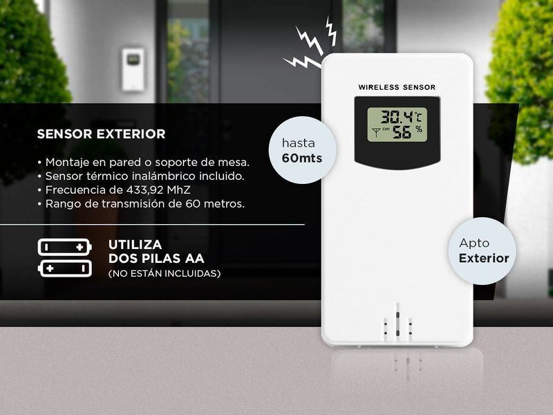 Tecnología de sensor de RF de alta tecnología: utilizando tecnología de sensor de RF de alta tecnología, el alcance es de hasta 60 m, el sensor exterior inalámbrico se puede colgar, datos de alta sensibilidad y pantalla de respuesta, control en tiempo real de temperatura y humedad, y la comodidad del medio ambiente en cualquier momento. Utiliza dos pilas AA (no incluidas) para que pueda utilizar donde y como quieras!