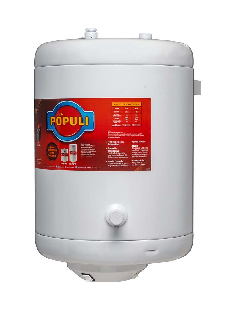 El Termotanque Eléctrico PÓPULI ELEC 53 Litros es una solución eficiente y segura para proveer agua caliente en tu hogar. Con una capacidad de 53 litros y una potencia de 1400 W, es ideal para hogares de hasta 2 personas, proporcionando agua caliente para una ducha continua sin interrupciones.