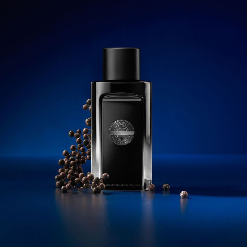 The Icon EDP, el nuevo perfume de Antonio Banderas. Una nota misteriosa y adictiva de ante y lirio, aderezada con notas aromáticas de fina