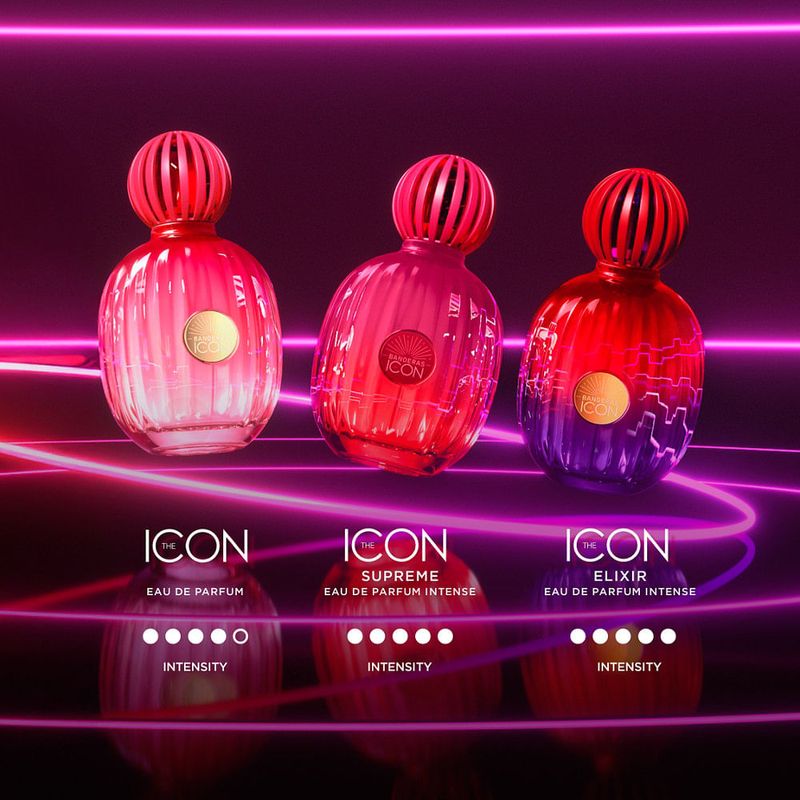 The Icon Elixir Eau de Parfum Intense de Antonio Banderas es una fragancia femenina intensa y sofisticada que celebra la feminidad audaz. Su composición combina la dulzura vibrante de frutos rojos y frambuesa con un corazón floral de jazmín y pimienta rosa, que aporta un toque elegante y especiado. En el fondo, las notas cálidas de sándalo y benjuí crean una estela envolvente, ambarada y seductora.