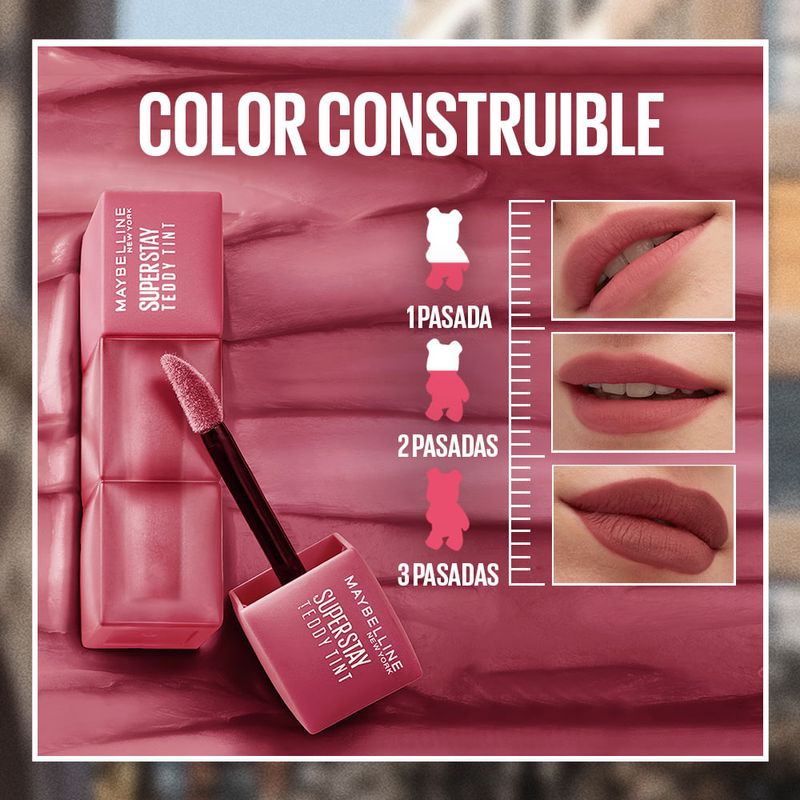 ¡Conocé la nueva tinta líquida para labios Super Stay Teddy Tint y experimentá una sensación tan suave y aterciopelada como un Teddy Bear! Hasta 12 horas de color intransferible, a prueba de bebidas y de besos. ¡Usálo como un look suave, difuminado o intenso!