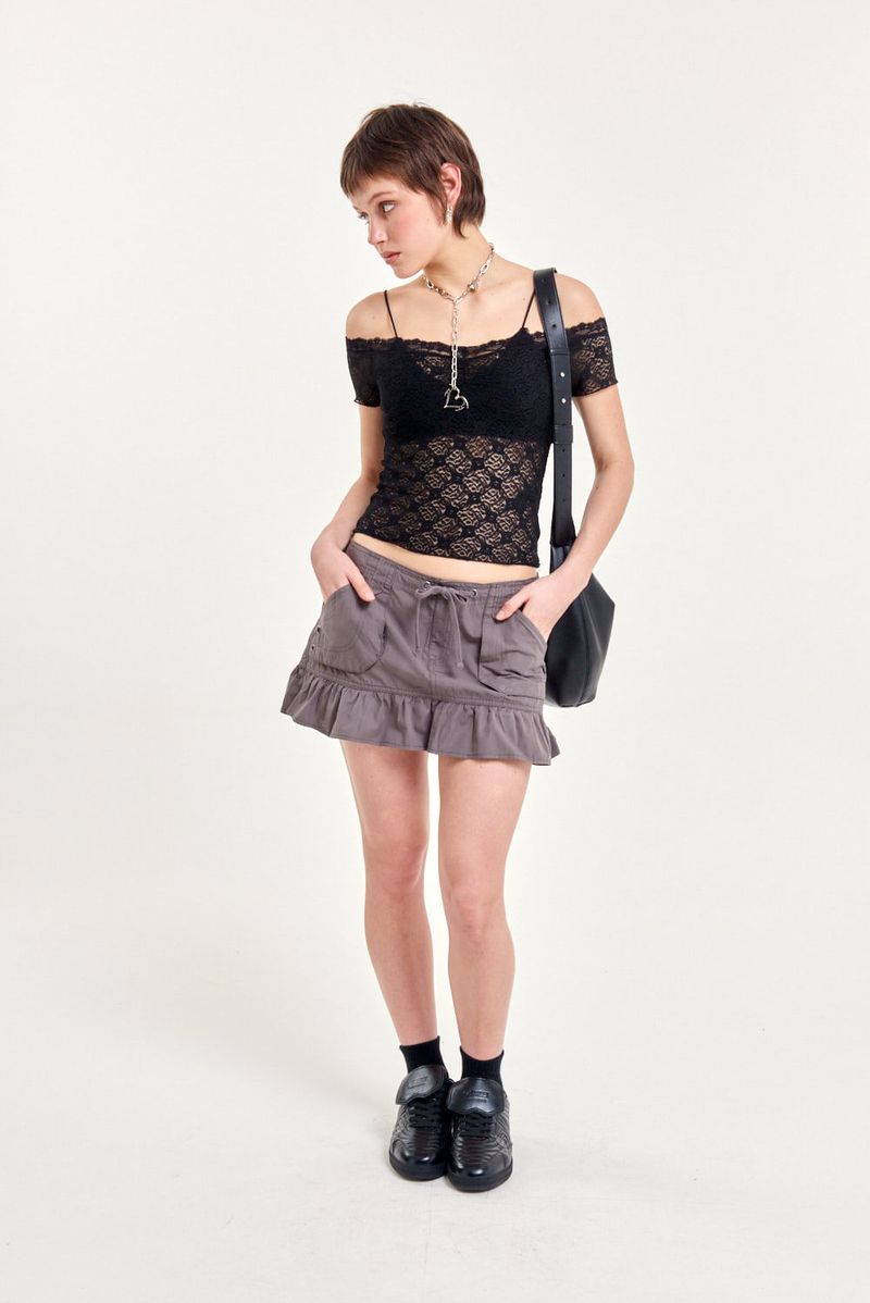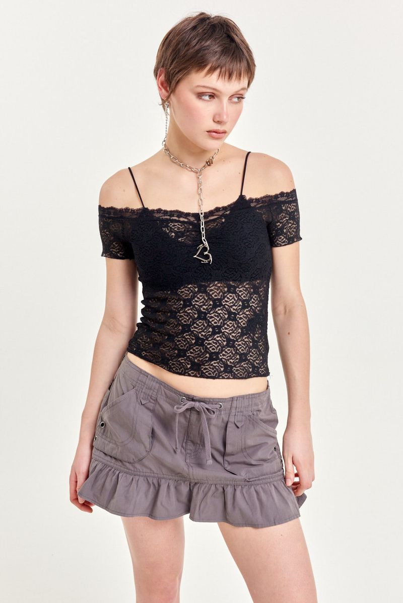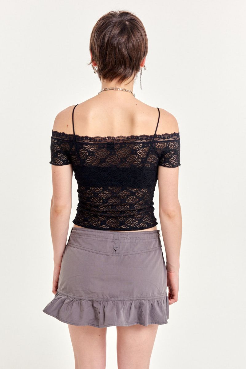 Top de encaje con cuello bote y mangas cortas, diseñado con frunce en el escote que realza el calce y terminaciones delicadas de encaje que aportan un aire romántico y sofisticado. Es una prenda versátil que podes usar con jeans para un look casual con un toque femenino, o combinar con faldas y accesorios para la noche.