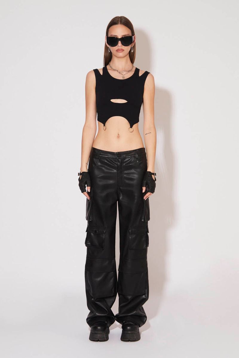 Top sin costuras tejido morley con abertura en zona de hombros. Detalle de sustracción en bajo busto. Terminación en bajo con argollas metálicas color plata. Linea Mich Kogan.