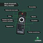 Su conectividad Bluetooth permite reproducir música de manera inalámbrica desde tu celular, tablet o notebook. También incluye entrada auxiliar mediante cable AUX, y control remoto para un manejo cómodo a distancia.