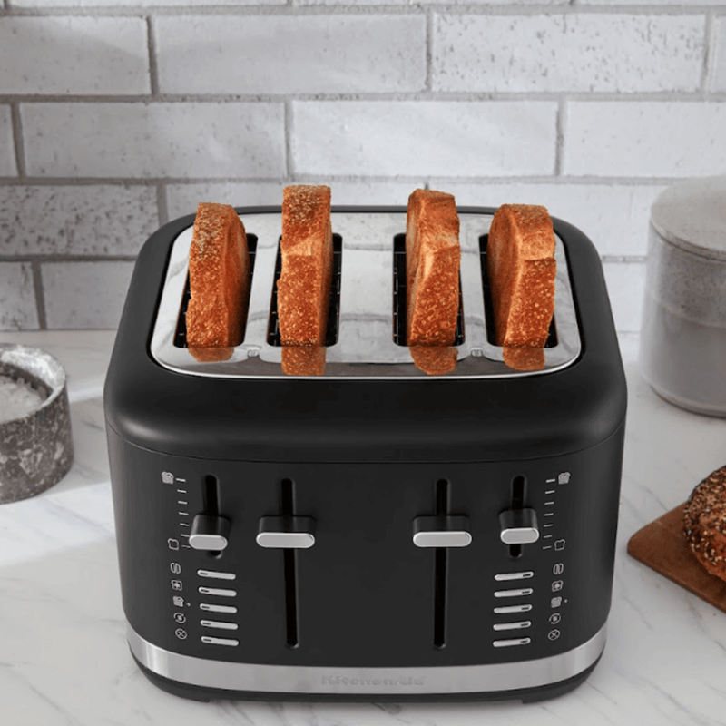 Esta tostadora KitchenAid® de 4 rebanadas cuenta con ranuras extra anchas para tostar una gran variedad de formas y tamaños, incluyendo panes caseros o artesanales.