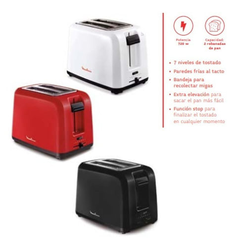 La Tostadora Moulinex Vita Negra es la elección perfecta para quienes buscan un tostado uniforme y personalizado. Con 7 niveles de tostado, podrás ajustar la intensidad según tus preferencias, asegurando que cada rebanada de pan alcance el dorado ideal. Su diseño elegante en color negro se adapta a cualquier cocina, aportando un toque moderno y sofisticado.