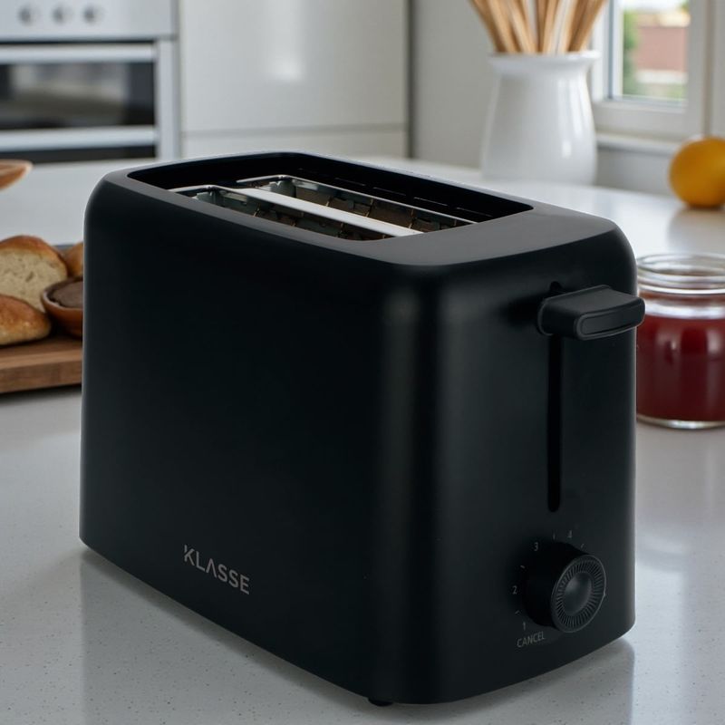 La tostadora KLASSE negra se destaca por su diseño moderno, compacto y resistente, ideal para cocinas contemporáneas. Ofrece 6 niveles de tostado que permiten personalizar el punto exacto de cada tostada, logrando resultados uniformes y precisos.