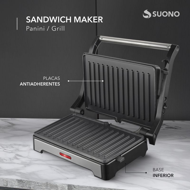 Prepara deliciosos sándwiches, paninis y más con la Tostadora Suono Panini Grill, un electrodoméstico versátil y práctico diseñado para facilitar tus comidas diarias. Su superficie de placas antiadherentes asegura una cocción uniforme y evita que los alimentos se peguen, mientras que su diseño compacto y elegante es perfecto para cualquier cocina.