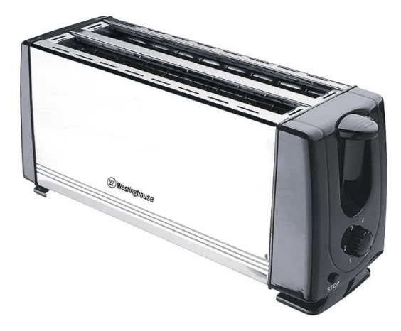 Tostadora Westinghouse cuenta con una potencia de 1400 watts y una capacidad para 4 pales, regulador de tiempo, bandeja recolectora de migas, 6 niveles de tostados y revestimiento en acero inoxidable.