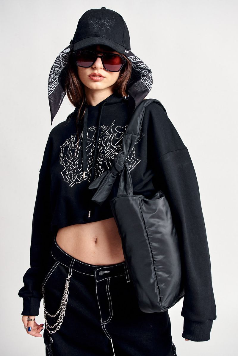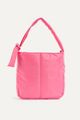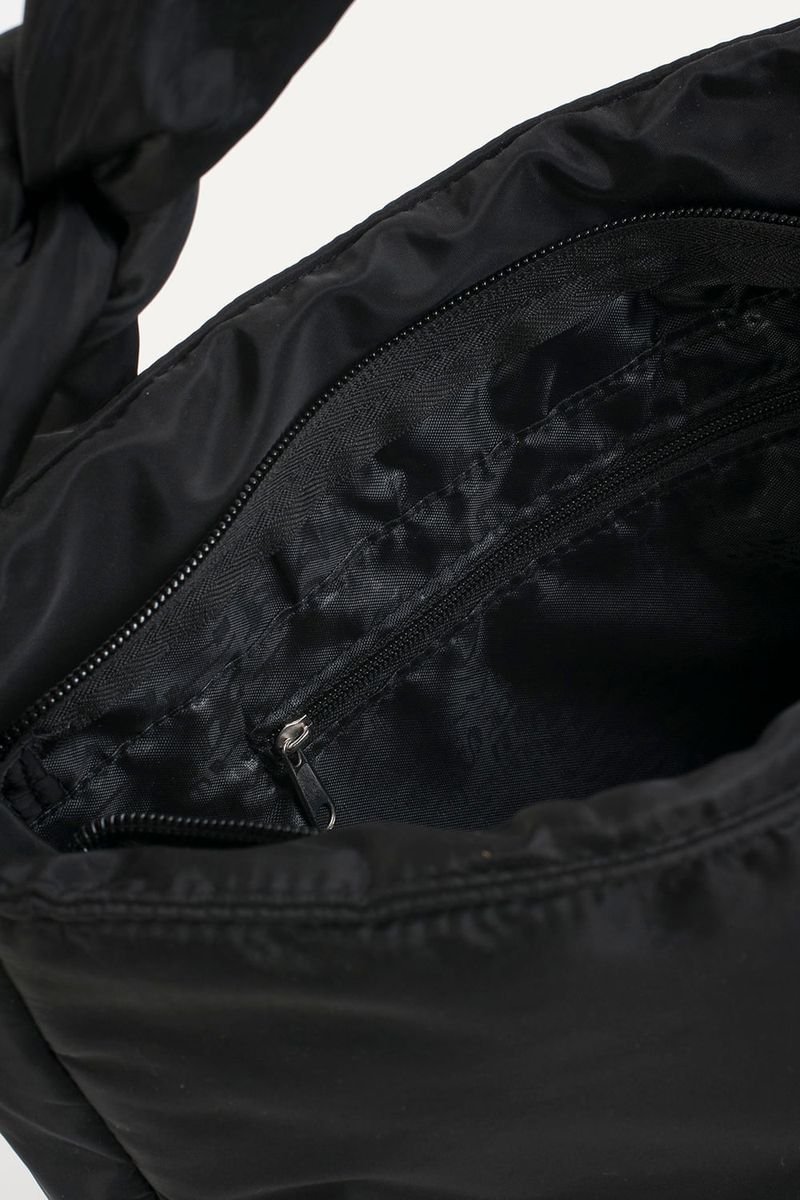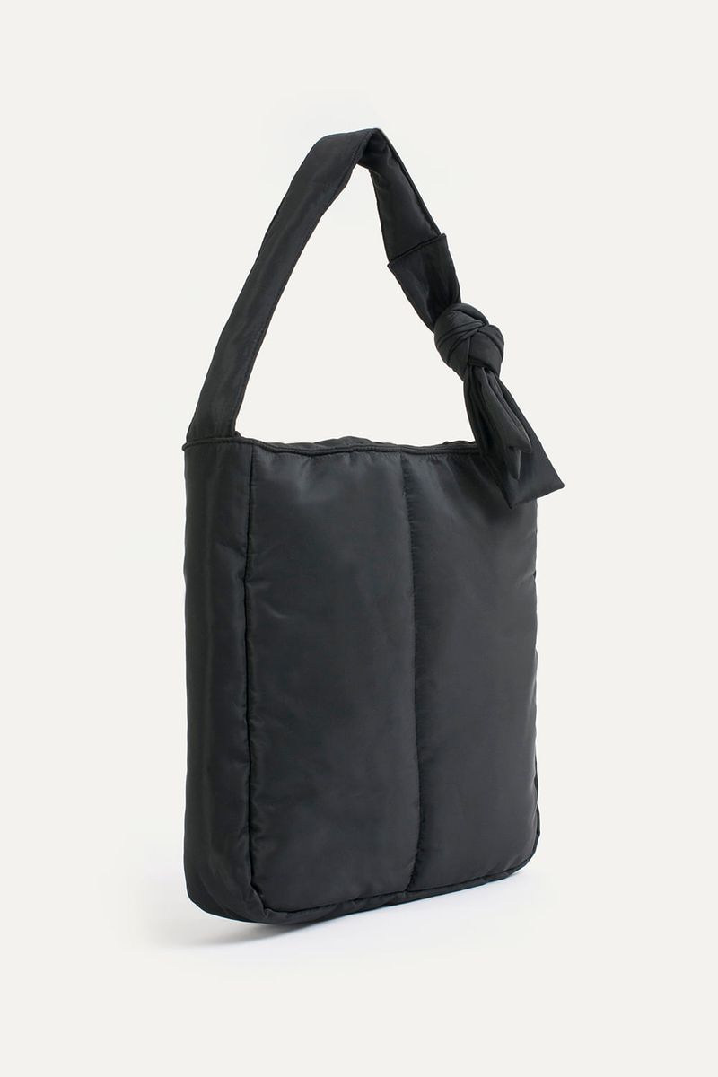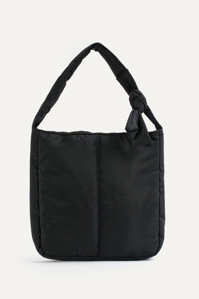 Tote bag acolchado formato rectangular de nylon con cierre. Manija acolcha con nudo. Bolsillo interno con cierre.