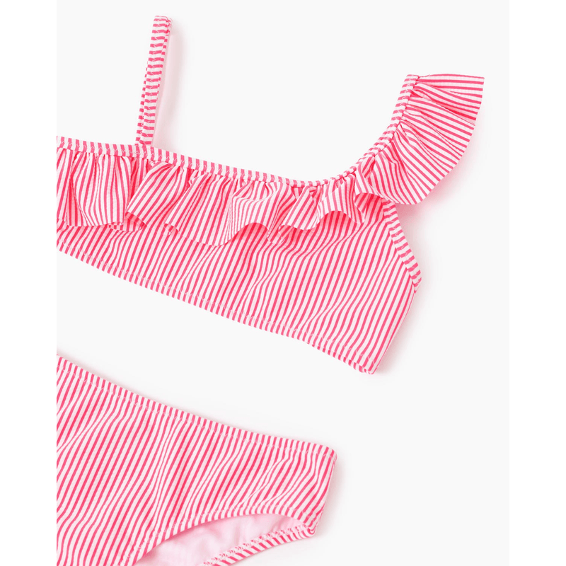 Bikini confeccionada en microfibra con textura cloque rayada. El top tiene escote irregular con volados y posee un bretel regulable y el otro fijo. Bombacha haciendo match. Ideal para pasar el verano esta temporada.