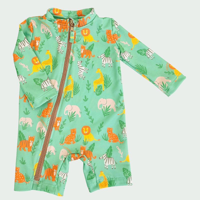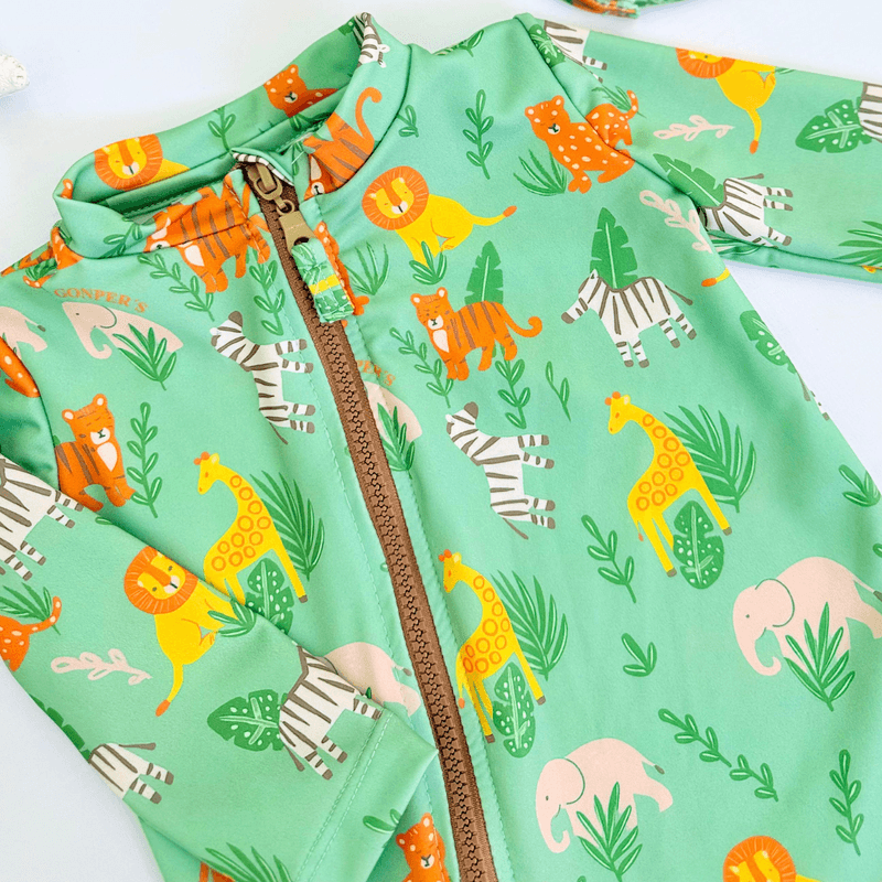 Malla enteriza para bebes de 6 meses a 2 años, que incluye el gorro piluso haciendo juego. A destacar: cierre en todo el largo, super fácil el cambio. Protección solar con certificación UV 50+. Para que lo use en pileta, playa, mar y natación.