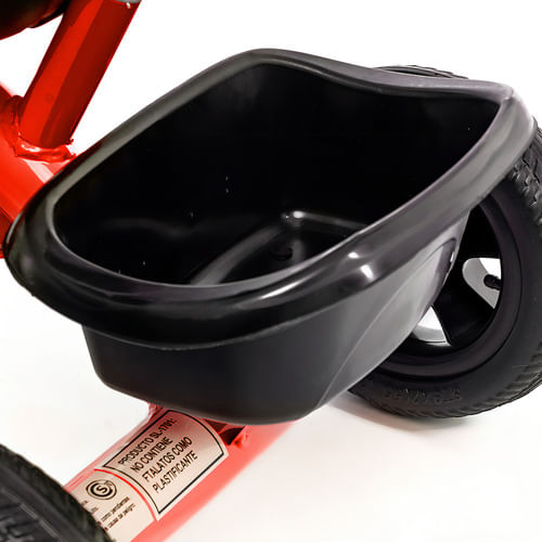 Además, el triciclo cuenta con un canasto portaobjetos tanto en la parte delantera como en la trasera, lo que proporciona un espacio útil para llevar juguetes, snacks u otros objetos pequeños.