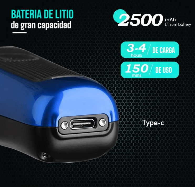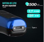 - Batería de iones de litio: 2500 mAh, 3 horas de carga completa para 120 minutos de uso.