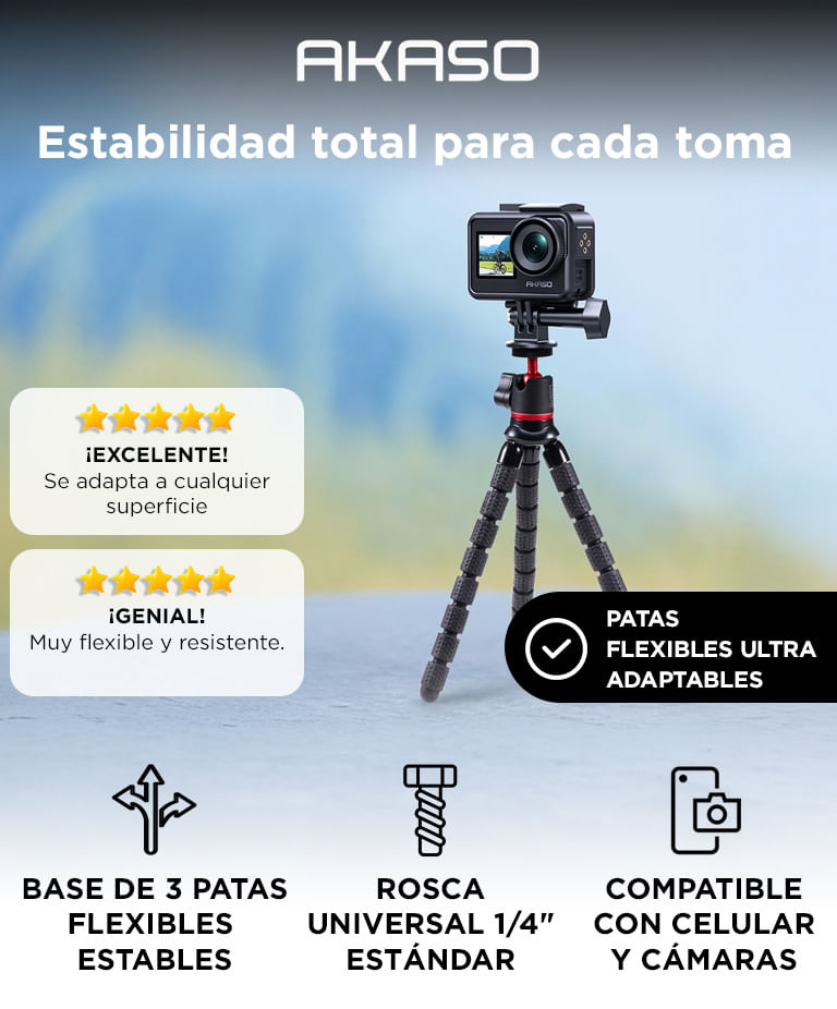 El trípode flexible AKASO incorpora patas articuladas tipo octopus que permiten colocarlo sobre superficies irregulares o sujetarlo a objetos. Esto brinda estabilidad para grabaciones más claras y fotografías más precisas tanto en interior como en exterior.