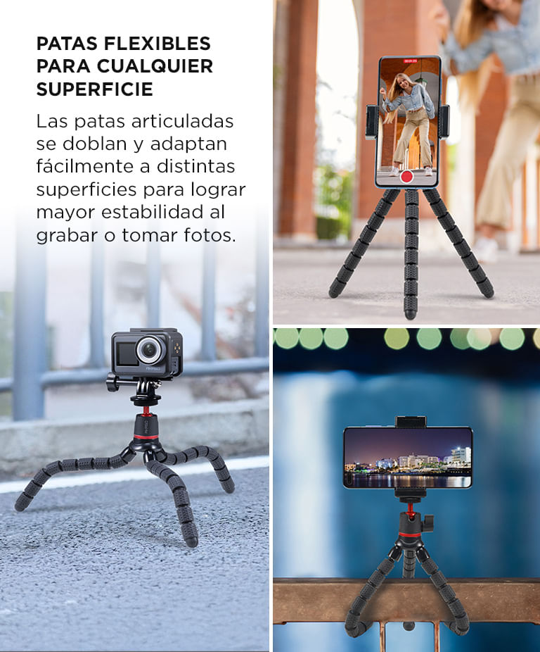 Puede utilizarse como trípode de mesa, soporte flexible o soporte portátil para cámaras y smartphones. Es una herramienta práctica para grabaciones manos libres, videollamadas, clases online y creación de contenido digital.