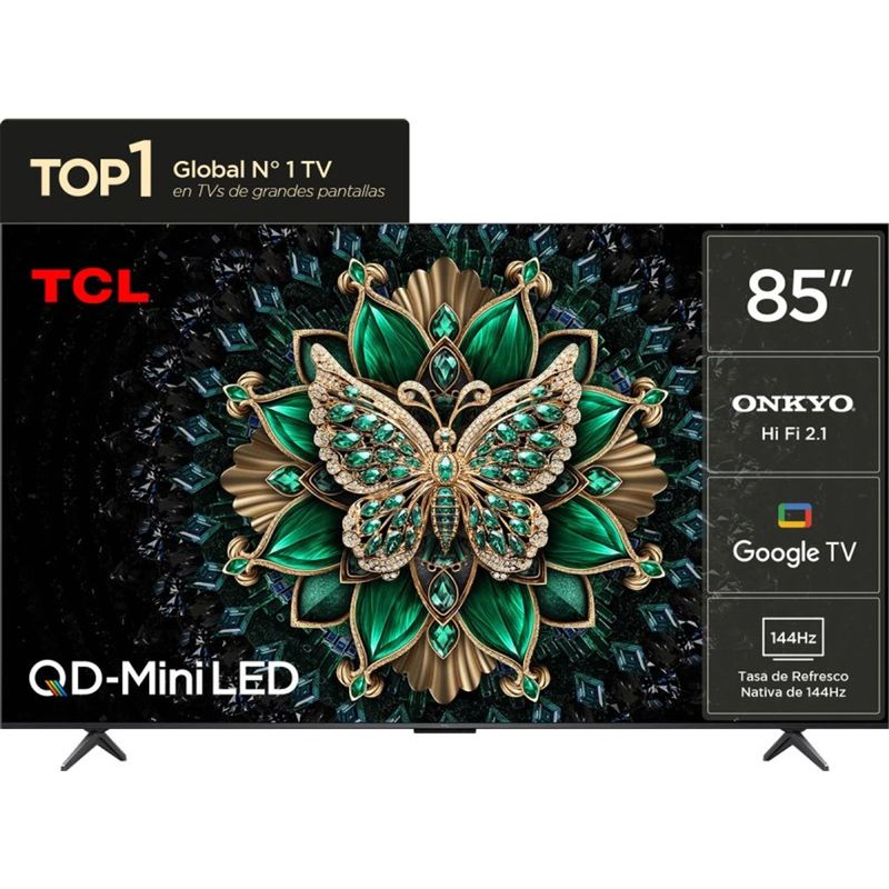 TV MINI LED 85P 85C6K UHD Google TV-RV TCL -Backlight Demura -Sistema operativo Google TV, -Dolby Vision IQ, -MEMC de 120 Hz y VRR de 144Hz. Game Master: HDMI2.1, VRR, ALLM, eARC -AMD FreeSync Premium, -Wi-Fi 6. -Sistema de sonido Onkyo 15W*2+ Subwoofer de 20 W -Motor AIPQ con AI SR, -Dolby Atmos -Control remoto multimedia. -MARCA: TCL -TAMA¦`O (Pulgadas): 85 -TIPO DE PANTALLA: PLANA -TIPO DE RESOLUCI¦"N: 4K UHD -RESOLUCI¦"N: 3840 x 2160 -FRECUENCIA DE REFRESCO DE PANTALLA (Hz): 120Hz / VRR 2K @288Hz, 4K@ 144Hz -TASA DE NITIDEZ EN MOVIMIENTO (Clear Motion Rate): 6,5 -QLED: SI -MINI LED: SI -PICTURE IN PICTURE: NO -SMART: SI -CAMARA WEB: NO -CTROL POR MOVIMIENTO: NO -CTROL. POR VOZ: SI -APLICACIONES: Netflix, YouTube, Spotify, Disney+, Amazon Prime Video, Google Play -FUNCI¦"N ESPEJO: SI -GAME MASTER: SI -CTROL REMOTO INTELIGENTE: SI -CANTIDAD DE PARLANTES: 3 -POTENCIA: 2x15W + 20W -SINTONIZADOR DIGITAL (TDA): NO -SINTONIZADOR TV-CABLE / ANTENA: SI -CONEXI¦"N A INTERNET: SI -BLUETOOTH: SI -HDMI: SI x4 -USB: SI x2 -ENTRADA DE PC: SI -SALIDAS AUDIO OPTICO DIGITAL: SI -ENTRADAS DE AUDIO/VIDEO RCA: SI -SALIDA PARA AURICULAR: SI -ENTRADAS DE VIDEO COMPONENTE: NO -NFC: NO -MEDIDAS SIN BASE (Cm): 189,2 x 5,79 x 108,8 -PESO SIN BASE (Kg): 32.6 -MEDIDAS CON BASE (Cm): 189,2 x 37,4 x 116,3 -PESO CON BASE (Kg): 33.3 -COMPATIBILIDAD CON SOPORTE DE PARED VESA (mm): 600 x 400 -MEDIDAS CON EMBALAJE (Cm): 206 x 19 x 126 -PESO CON EMBALAJE (Kg): 49.5 -LENTES 3D: NO -CTROL REMOTO: SI -CABLE DE ALIMENTACI¦"N: SI -DONGLE: NO -PILAS: NO -SOPORTE DE PARED: NO -MODELO: 85C6K -GARANT¦ìA FABRICANTE: 12 meses -ORIGEN: Argentina