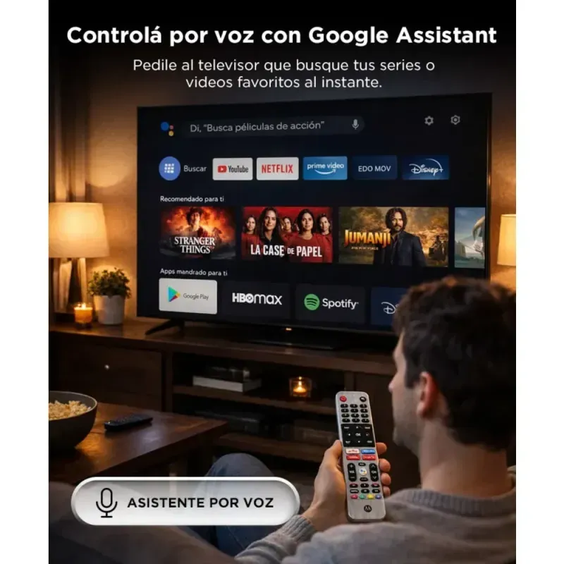 Incluye Chromecast integrado que permite enviar contenido desde el celular o la computadora al televisor. La conectividad wifi y bluetooth facilita la vinculacion con distintos dispositivos. Tambien incorpora Google Assistant para realizar busquedas y controlar funciones por voz. Todo esta pensado para un uso simple y practico.