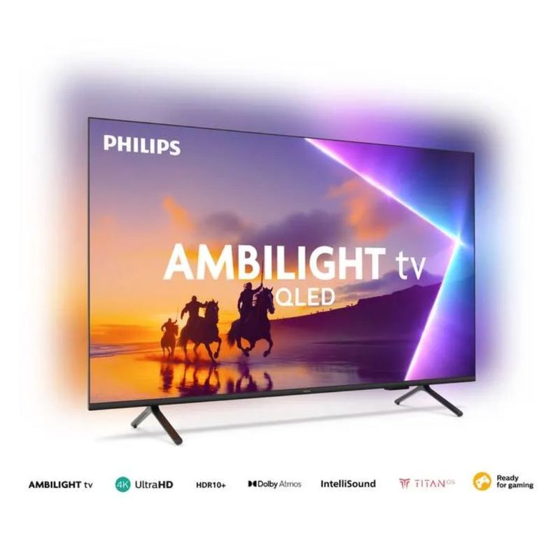 El televisor Philips QLED 50? 4K Ambilight ofrece imágenes intensas y realistas gracias a su panel QLED y tecnología HDR10+. Su sistema Titan OS brinda acceso rápido y sencillo a todas tus aplicaciones favoritas. Con Dolby Atmos y DTS:X, transforma tu living en una experiencia de cine. Su diseño moderno y el Ambilight de tres lados generan una inmersión única en cada contenido