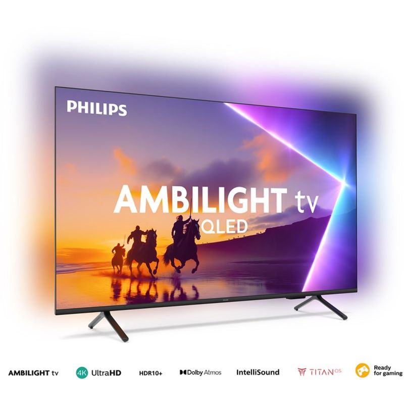 TV QLED SMART 65P 4K 65PUD8250/77 TITANAMBILIGHT -Tipo de producto: QLED 4K Ultra HD -Tama¦±o de pantalla: 65 pulgadas -Resoluci¦nn de pantalla: 3840 x 2160p -Motor de im¦¡genes: Pixel Precise UltraHD -Sistema operativo: TITAN -Memoria interna: 8 GB Flash -Colores del TV: Bisel negro mate / Inferior pl¦¡stico negro -Dise¦±o del soporte: Pl¦¡stico, en formade barra de jab¦nn, color negro -Funciones de Ambilight Versi¦nn Ambilight: 3 lados -Funciones: Ambilight Suite Modo de luz Sal¦nn AmbiSleep Alarma de amanecer Animaci¦nn FTI de Ambilight Mejoras de Imagen -Tecnolog¦_as incluidas: Microatenuaci¦nn Ultrarresoluci¦nn Natural Motion Crystal Clear -Modos de imagen: Personal, Cine en casa, ECO, Pel¦_cula, Juego, Monitor -Compatibilidad de Resoluci¦nn de Entrada 640 ¦_ 480 @ 60 Hz 576p @ 50 Hz 720p @ 50/60 Hz 1080p @ 24/25/30/50/60 Hz 2560 ¦_ 1440 @ 60 Hz 3840 ¦_ 2160p @ 24/25/30/50/60 Hz -Sintonizador / Recepci¦nn / Transmisi¦nn -Compatibilidad HEVC: S¦_ -Funciones Smart TV -Aplicaciones preinstaladas: Disney+, Netflix, YouTube, Amazon Prime Video, Globoplay (HTML), Aplicaci¦nn NFT -Asistente de voz: Control remoto con micr¦nfono -Compatibilidad Smart Home: MATTER -Gamebar: Gamebar 2.0 -Reproducci¦nn Multimedia -Video: AVI, MKV, HEVC, H.264, MPEG1/2/4, VP9, AV1 -Audio: MP3, WAV, AAC, FLAC -Im¦¡genes: JPEG, GIF, PNG, BMP -Subt¦_tulos: SRT, SMI, SSA, SUB, ASS, TXT -Configuraci¦nn: 2.0 canales -Potencia RMS: 20 W (2 x 10W) -Altavoces: Graves de gama completa (FR01A) -Motor de sonido: IntelliSound -C¦ndecs: Dolby Atmos, DTS:X -Mejoras: Di¦¡logos n¦_tidos Sonido con IA Ecualizador con IA Nivelador Dolby Modo nocturno Mejora de graves Dolby -HDMI: 3 puertos (HDMI 1 con eARC) -USB: 2 puertos -HDMI 2.1: UHD 48#60 Hz en todos los puertos, eARC en HDMI 1 -HDMI CEC (EasyLink): Reproducci¦nn con un toque, control de audio y energ¦_a -Wi-Fi 802.11ac (2x2, banda dual) -Bluetooth 5.0 -Compatibilidad HDCP 2.3: S¦_, en todos los HDMI -Funciones de juegos: ALLM, HDMI VRR -HDR: HDR10+ -Alimentaci¦nn: CA 100#240 V, 50/60 Hz -Modo de espera: