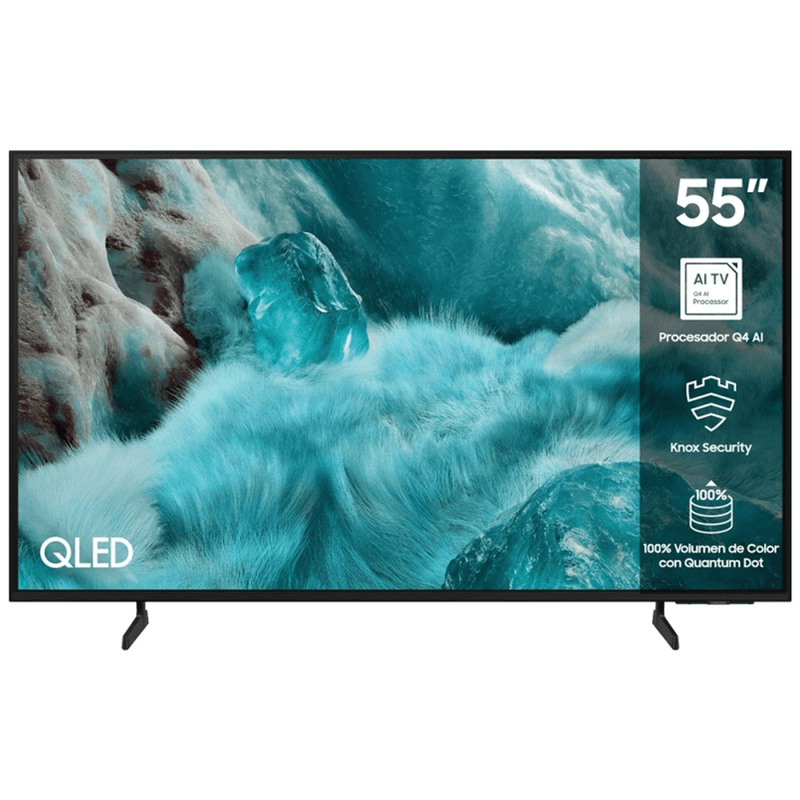 TV QLED SMART 55P 4K QN55Q7FAAGCZB SAMSUNG -Tama¦±o: 55 pulgadas -Resolucion: 4K UHD (3840 x 2160) -Frecuencia de refresco: 50Hz -Motor de imagen: Q4 AI Processor -HDR: Quantum HDR -HDR10+ -Micro Dimming: Supreme UHD Dimming -Contraste: Mega Contraste -Contrast Enhancer -Motion Technology: Motion Xcelerator -Upscaling: 4K Upscaling -HDR Brightness Optimizer -Color Booster: Color Booster Pro -Filmmaker Mode -Calibracion Inteligente: Basica -AUDIO -Potencia de salida (RMS): 20W -Tipo de parlantes: 2CH -Object Tracking Sound (OTS): OTS Lite -Q-Symphony -Adaptive Sound -SMART -Sistema Operativo: Tizen Smart TV -Bixby -Navegador web -Apple AirPlay -SmartThings -Conectividad Multiple: Mobile to TV, TV initiate mirroring, Sound - Mirroring, Wireless TV On -Multi-View: Hasta 2 videos -Generative Wallpaper -Daily+ -Karaoke Mic -Storage Share -IP Control -JUEGOS Y GAMING -Auto Game Mode (ALLM) -Game Motion Plus -Super Ultra Wide Game View -MiniMap Zoom -HGiG -AI Auto Game Mode -SINTONIZADORES -TDA (ISDB-T) -Sintonizador analogico -TV Key -CONECTIVIDAD -Wi-Fi: Si (Wi-Fi 5) -Bluetooth -HDMI: 3 entradas (4K 60Hz en HDMI 1/2/3) -HDMI ARC: eARC -Anynet+ (HDMI-CEC) -USB: 1 x USB-A -LAN (Ethernet): 1 -Salida digital optica -Salida de audio (minijack) -Entrada RF: 1/1 (Uso comun terrestre) -DISE¦`O -Dise¦±o: Slim Look -Tipo de bisel: 3 Bezel-less -Color frontal: Negro -Tipo de base: Flat Feet Narrow -DIMENSIONES Y PESO -Con base (mm): 1234.1 x 758 x 237 -Sin base (mm): 1234.1 x 710.8 x 60.3 -Tama¦±o de paquete (mm): 1369 x 819 x 127 -Peso con base: 11.1 kg -Peso sin base: 10.8 kg -Peso con empaque: 15.7 kg -ENERGIA -Fuente de alimentacion: AC 220-240V ~ 50/60Hz -Consumo Maximo: 130W -Eco Sensor -Auto Power Saving -Auto apagado -ACCESORIOS -Modelo de control remoto: TM2360E -Cable de alimentacion -Manual de usuario -Slim Fit Wall Mount -Studio Stand Support -Full Motion Slim Wall Mount (Y22) -SlimFit Cam Support -Zigbee / Thread Module: Soporta dongle -Modelo: QN55Q7FAAGCZB -Garant¦_a fabricante 12 meses -Origen Vietnam