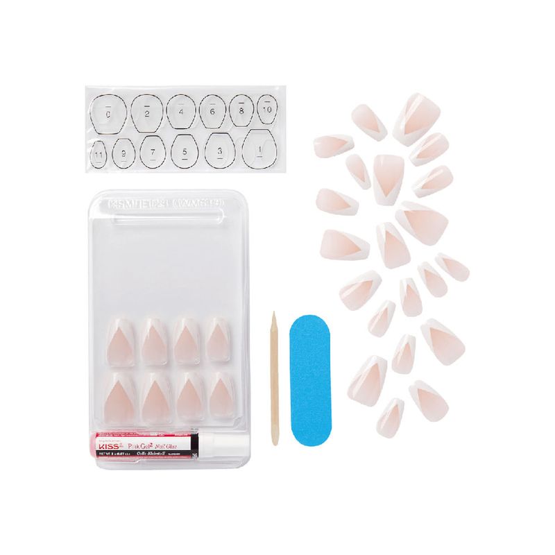 El kit contiene: 28 uñas, pegamento de gel rosa (2g), mini lima y bastón de manicure.