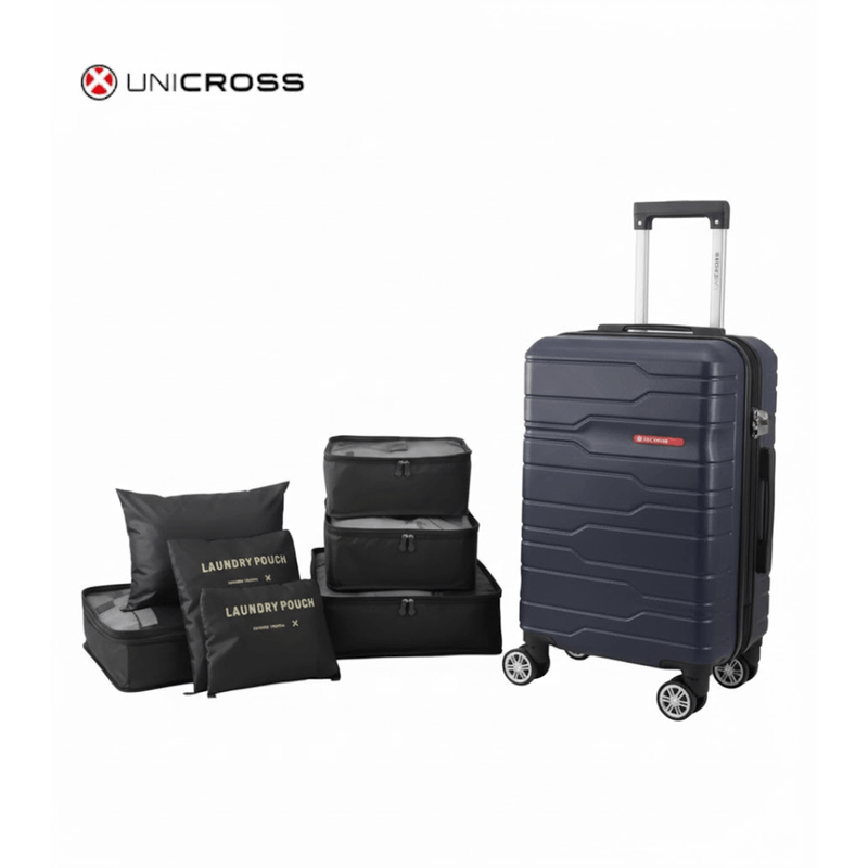 Valija Carry On ABS 20" Unicross con candado con combinación. 4 ruedas 360 grados extraibles. Cuenta con un compartimiento con una funda con cierre y en su interior un elástico para sujetar las pertenencias. Por otro lado contiene un cierre con un bolsillo de red que funciona como tapa para el espacio. Carro de aluminio interno y retráctil, ruedas de silicona. Medidas: 50 cm alto / 34 cm ancho / 23 cm prof. Peso: 3 kgs. Ademas incluye un Organizador de Viaje Set X6. El Organizador de Viaje Set X6 es el compañero perfecto para tus aventuras. Este set de 6 unidades te brinda la capacidad y versatilidad que necesitas para organizar tu ropa y accesorios de viaje de manera eficiente. Practico organizador para valijas 6 en 1. Este set con 6 organizadores de distintas medidas te permite guardar en tu valija tu ropa zapatos cosméticos de una manera ordenada y práctica.
