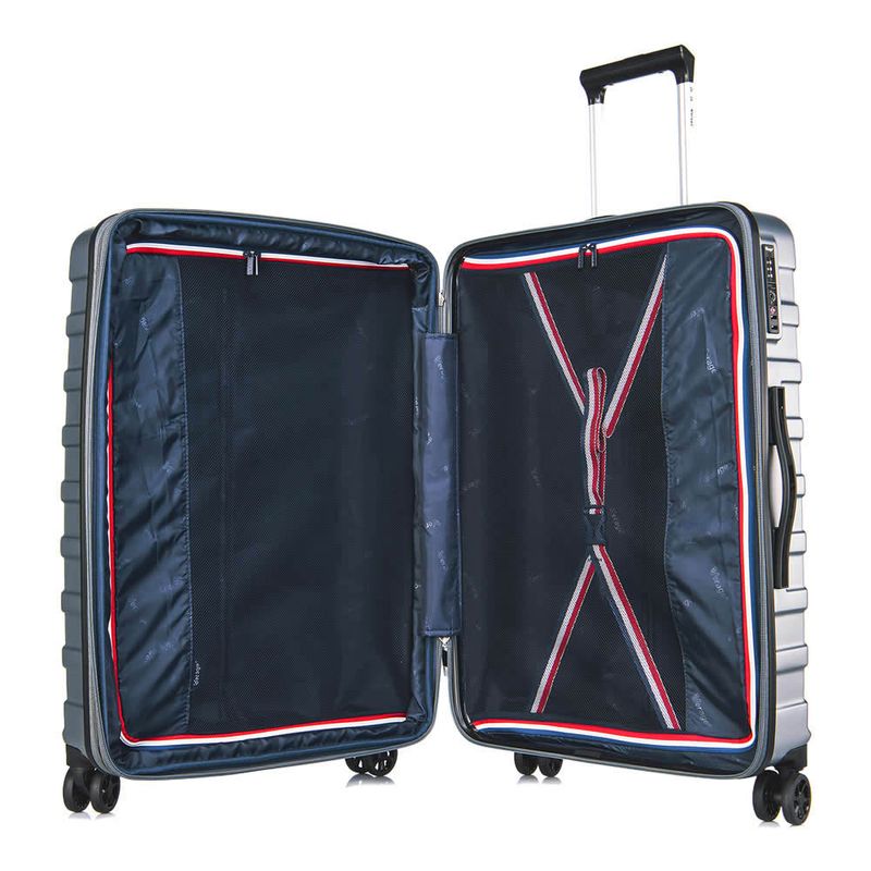 Sistema de carro de aluminio / acero con tubo plateado 8 ruedas silenciosas para mejor deslizamiento y balanceo Interior forrado con división de red para una fácil organización y almacenamiento. y correas de sujeción en el compartimento principal