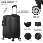 La Valija Wanderlust Hard ABS 20” Expandible combina resistencia, estilo y practicidad para tus viajes. Fabricada en ABS con textura hair fine, es liviana y duradera, ideal para acompañarte en cualquier aventura. Cuenta con ruedas dobles fijas 360° para un desplazamiento suave, asa telescópica doble con botón retráctil y manija de agarre superior que facilitan su transporte. Su interior de poliéster estampado con elásticos internos mantiene tu equipaje organizado, mientras que el cierre expansible y la cerradura con combinación numérica brindan seguridad y comodidad en todo momento. Sus medidas son 51 x 36 x 25 cm, perfecta como equipaje de mano.