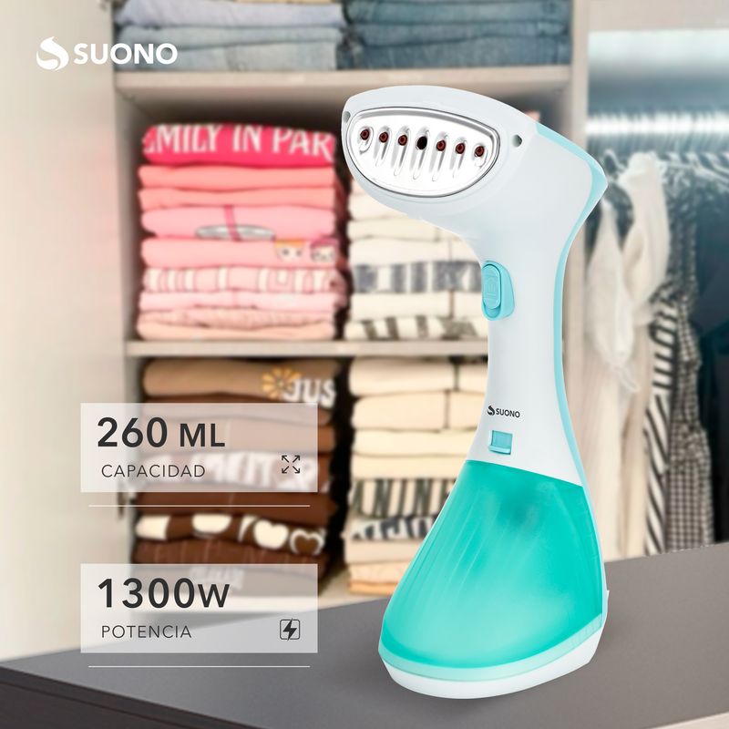 El Vaporizador de Prendas Suono es la solución perfecta para eliminar arrugas rápidamente y mantener tu ropa siempre impecable. Con 1300W de potencia, un diseño compacto y un tanque desmontable de 260 ml, este vaporizador es práctico, eficiente y fácil de usar. Ideal para el hogar o para llevar de viaje, ofrece resultados profesionales sin necesidad de tabla de planchar.